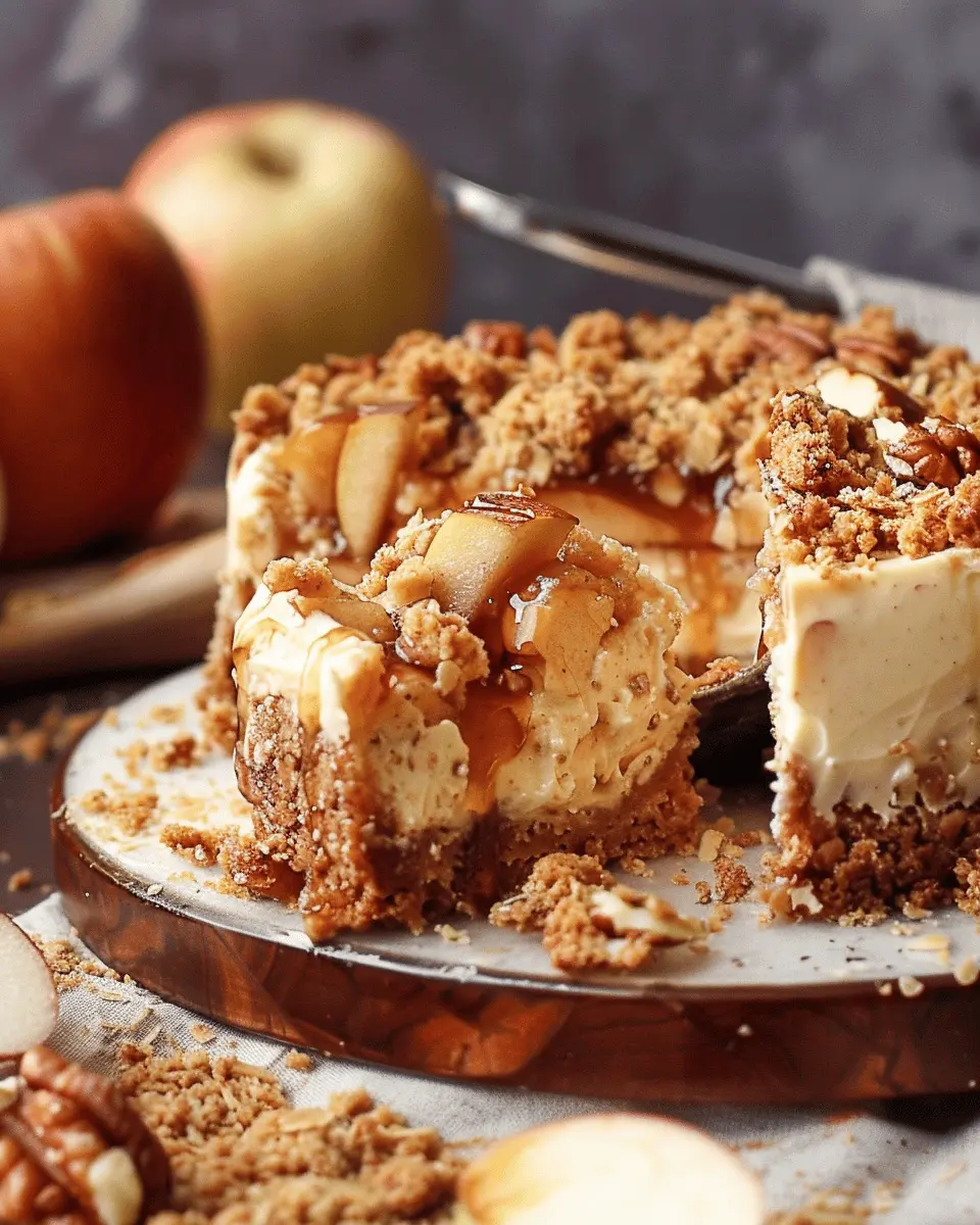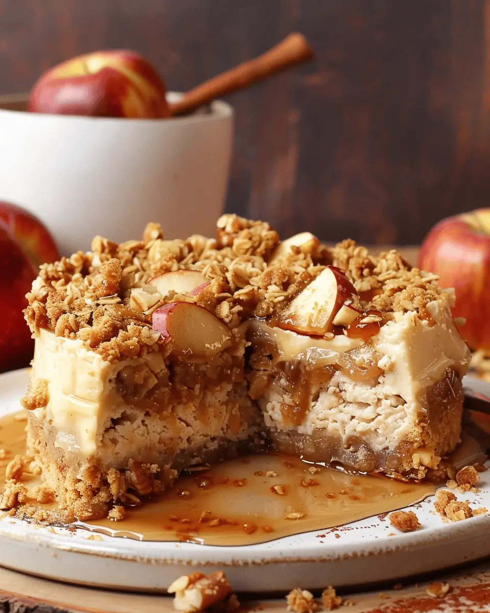 Imagine the layers—crust, apple goodness, creamy cheesecake, and then that crunchy topping all in one bite!