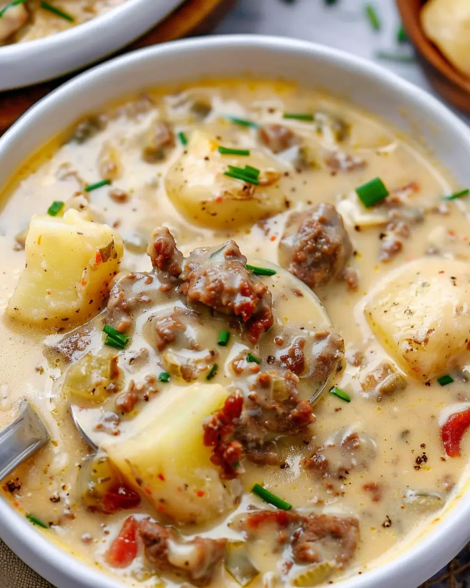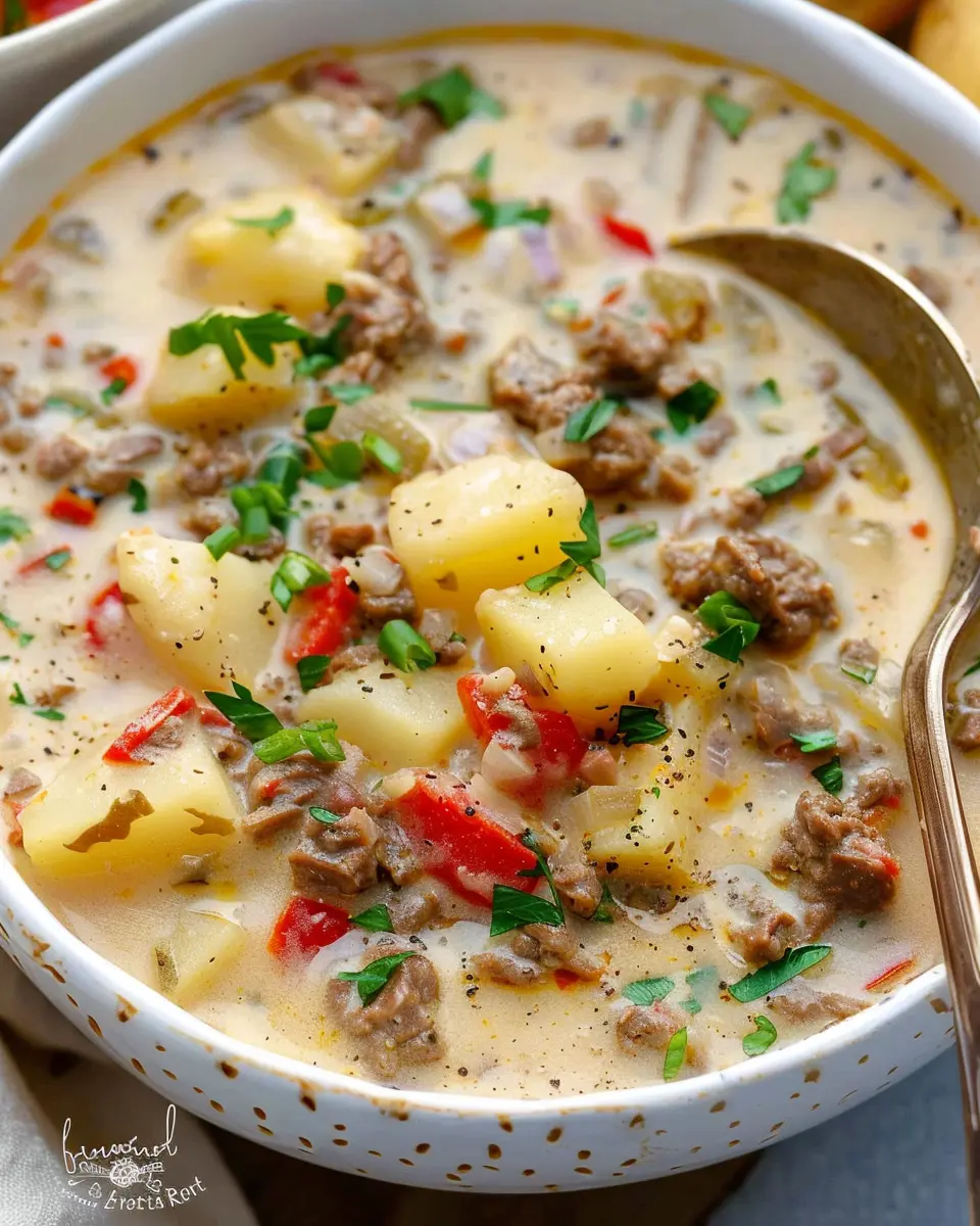 If you’re looking to enjoy this comforting soup without meat, consider a vegetarian version! Swap out the beef with hearty mushrooms or a mix of colorful bell peppers to provide that satisfying umami flavor. Use vegetable broth as your base, and don’t forget to load it up with protein by adding lentils or chickpeas. The creaminess from the potatoes paired with the savory spices can make even the pickiest eaters fall in love with this meatless alternative.