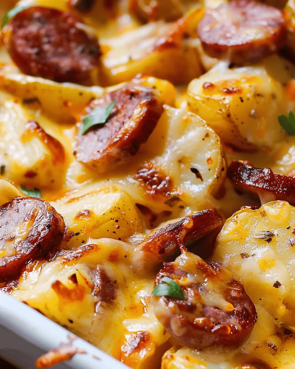 • Mix Potatoes and Sausage: In a large mixing bowl, combine the cubed potatoes, browned smoked sausage, and the creamy cheese sauce.