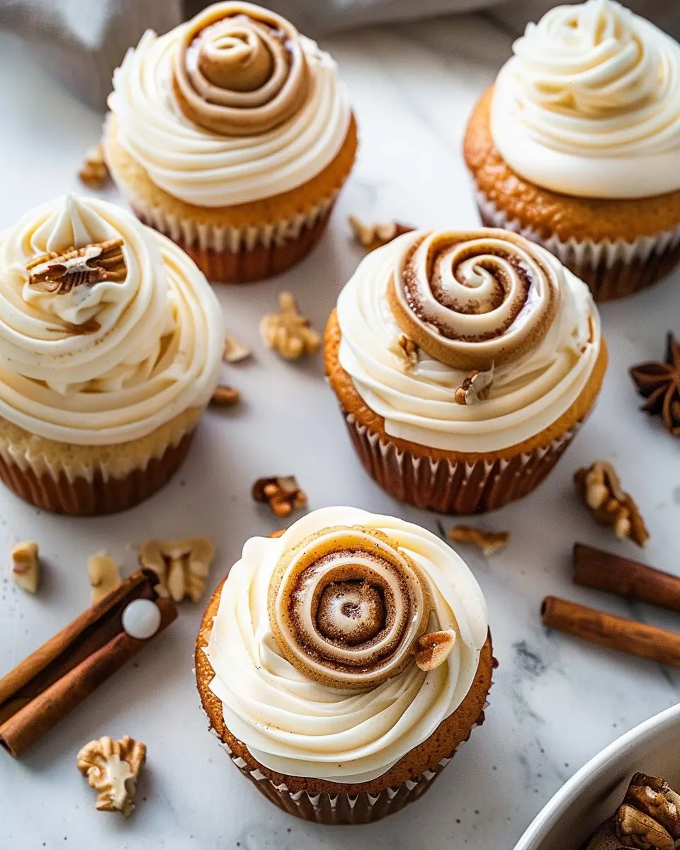 Once the cupcakes are cooled, frost them generously with the glaze. You can even add those cinnamon rolls on top for an eye-catching presentation (and a sugar boost)! Finish with a sprinkle of chopped walnuts or pecans for an added crunch.