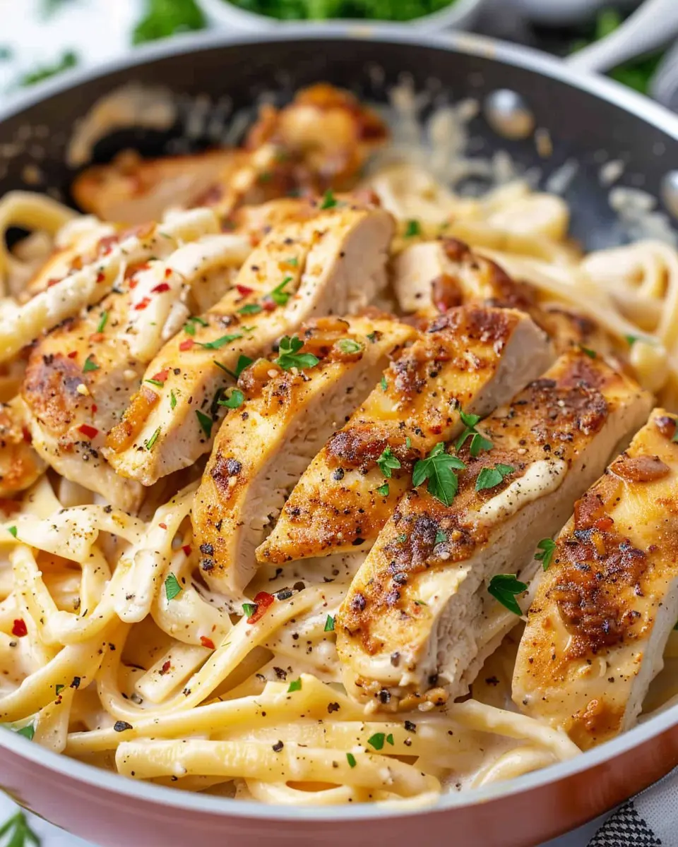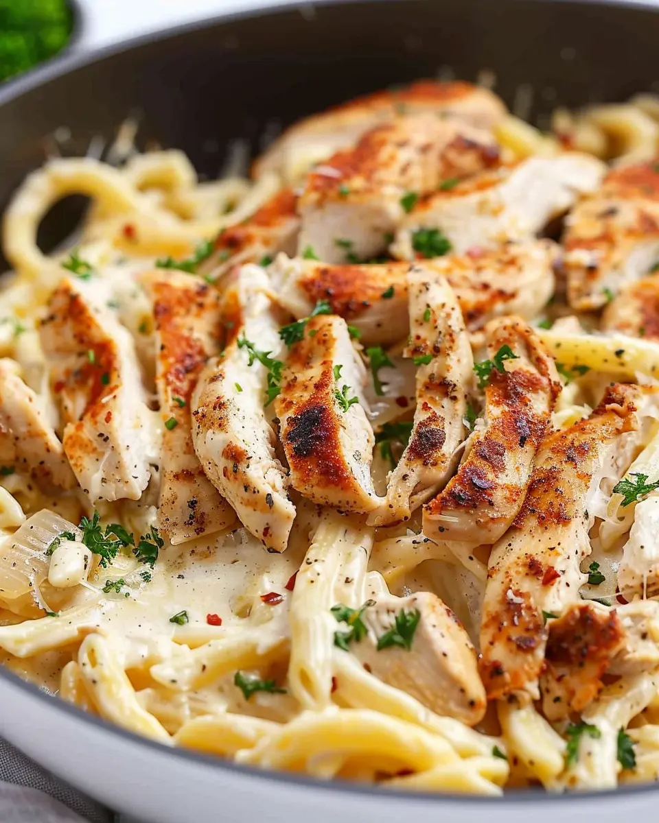 This is where everything comes together! Toss the cooked pasta, sliced chicken, and the creamy sauce right into the skillet.