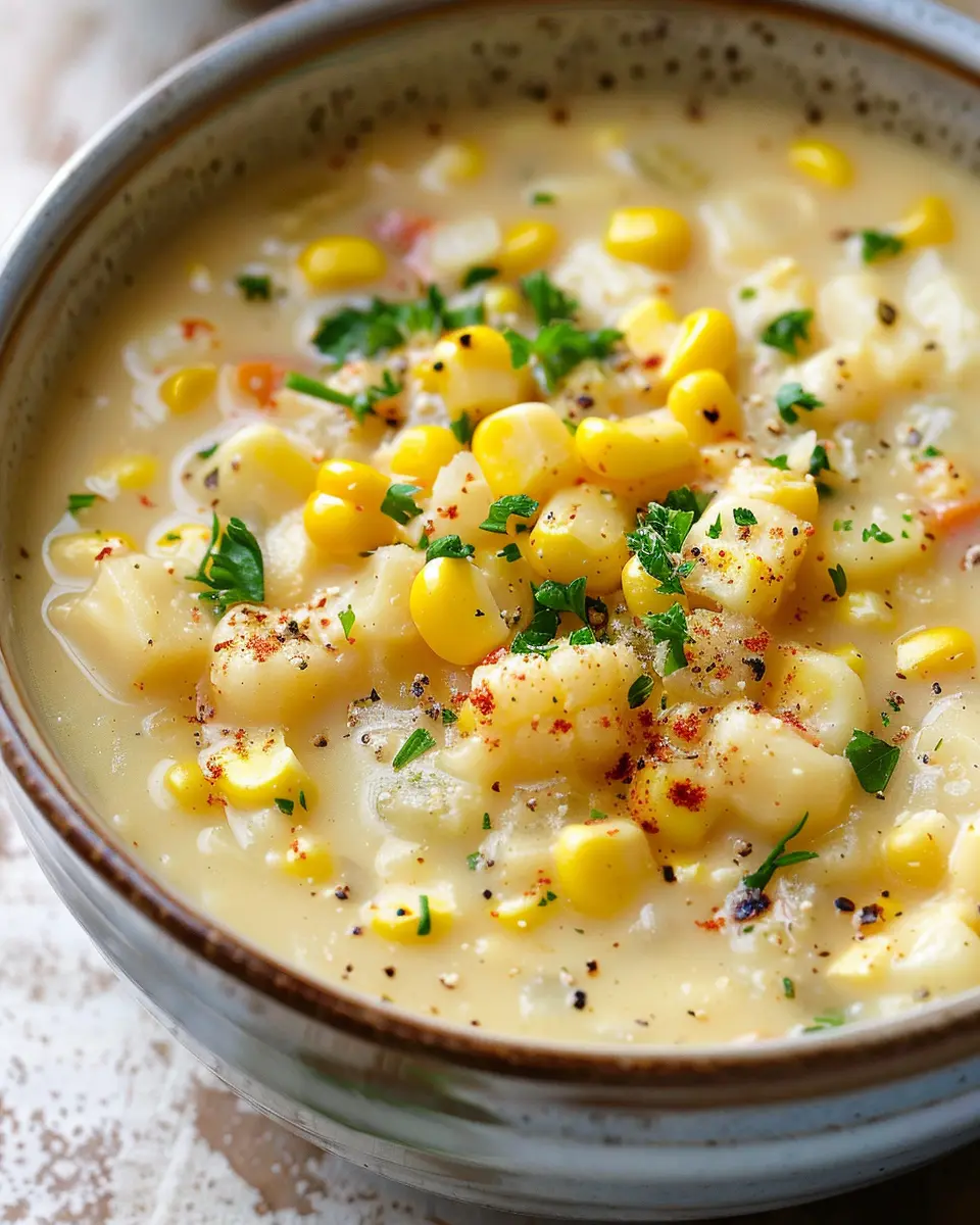 Your creamy corn chowder is now ready to be served! Pair it with some crusty bread or a light salad for a complete meal. If you enjoyed this recipe, consider checking out similar soup ideas on sites like AllRecipes or Food Network for more inspiration. Happy cooking!