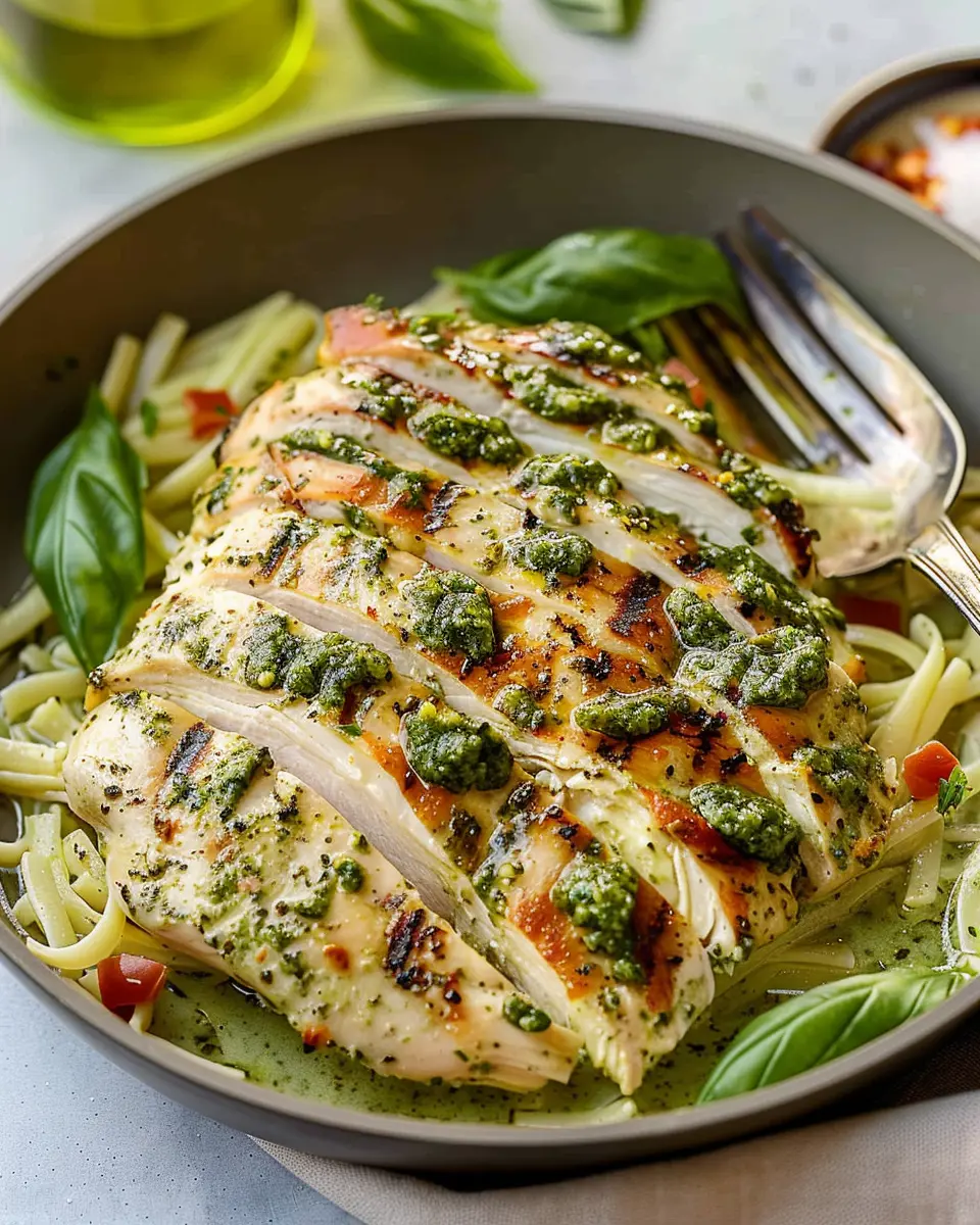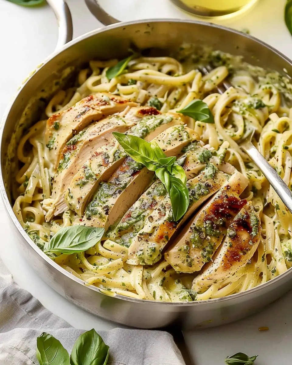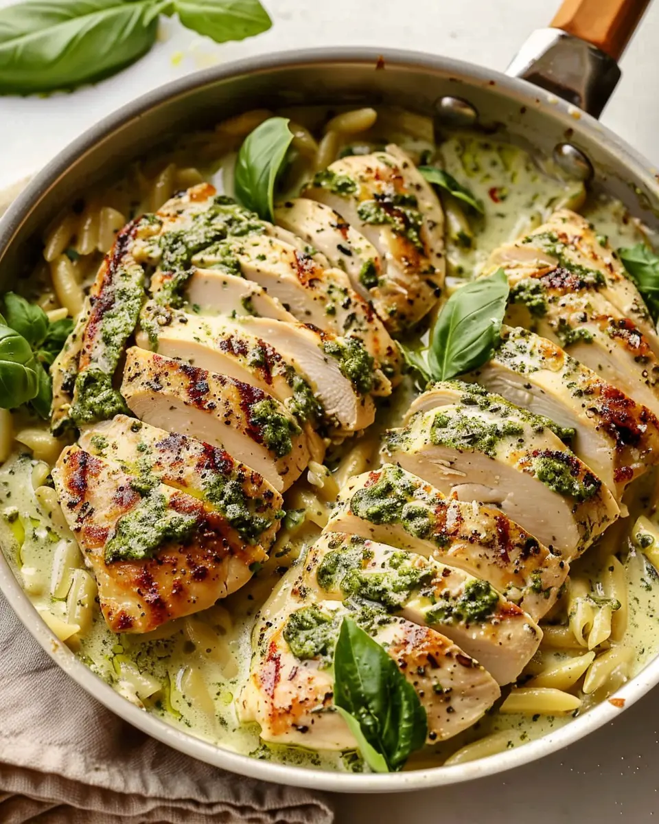 A deliciously easy dinner idea that combines tender chicken with creamy pesto sauce.