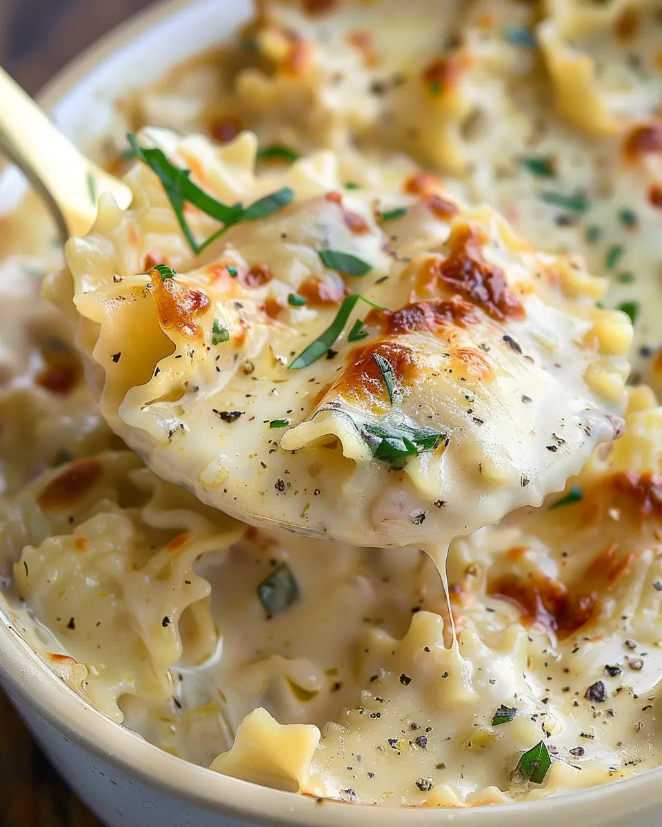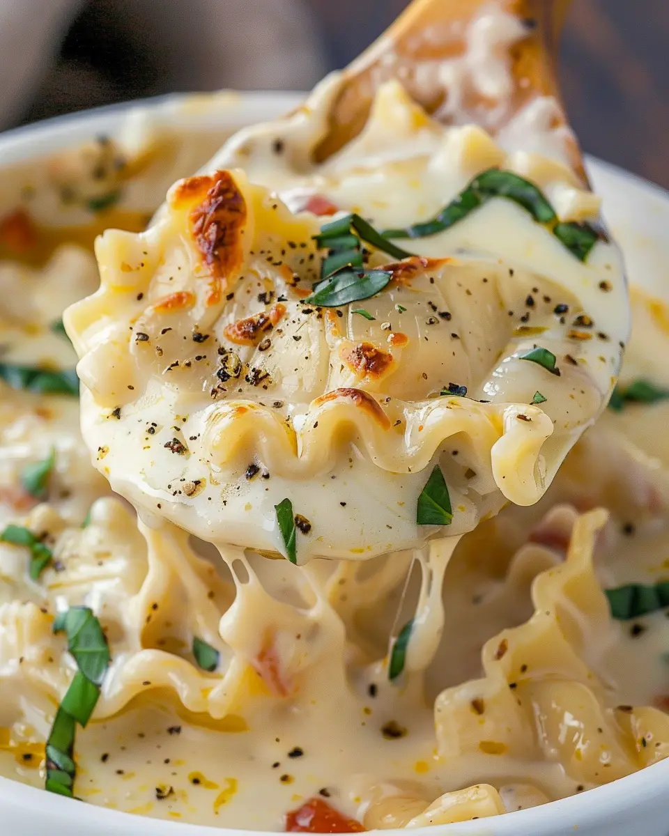 This Crockpot White Lasagna Soup is a comforting blend of flavors featuring turkey bacon and creamy goodness.