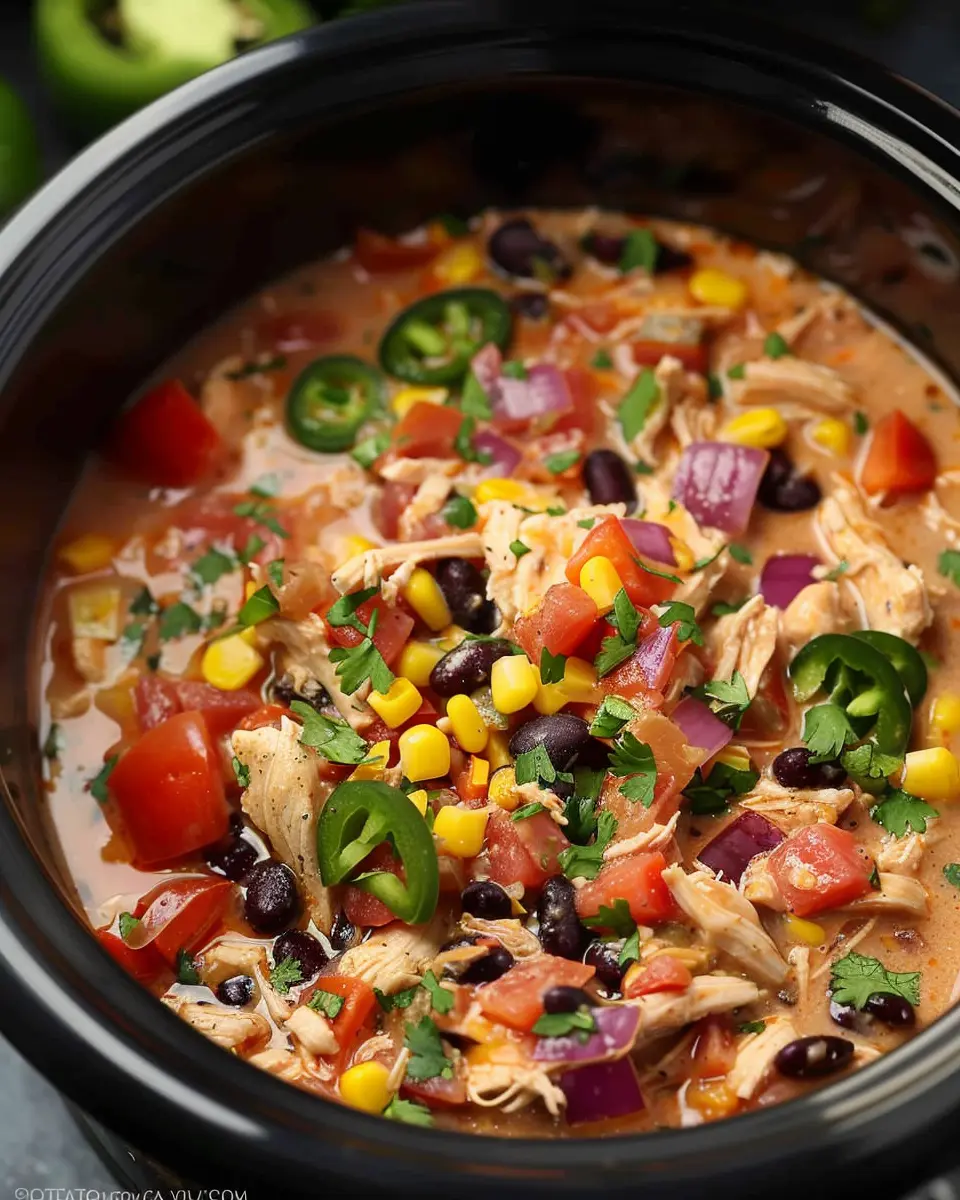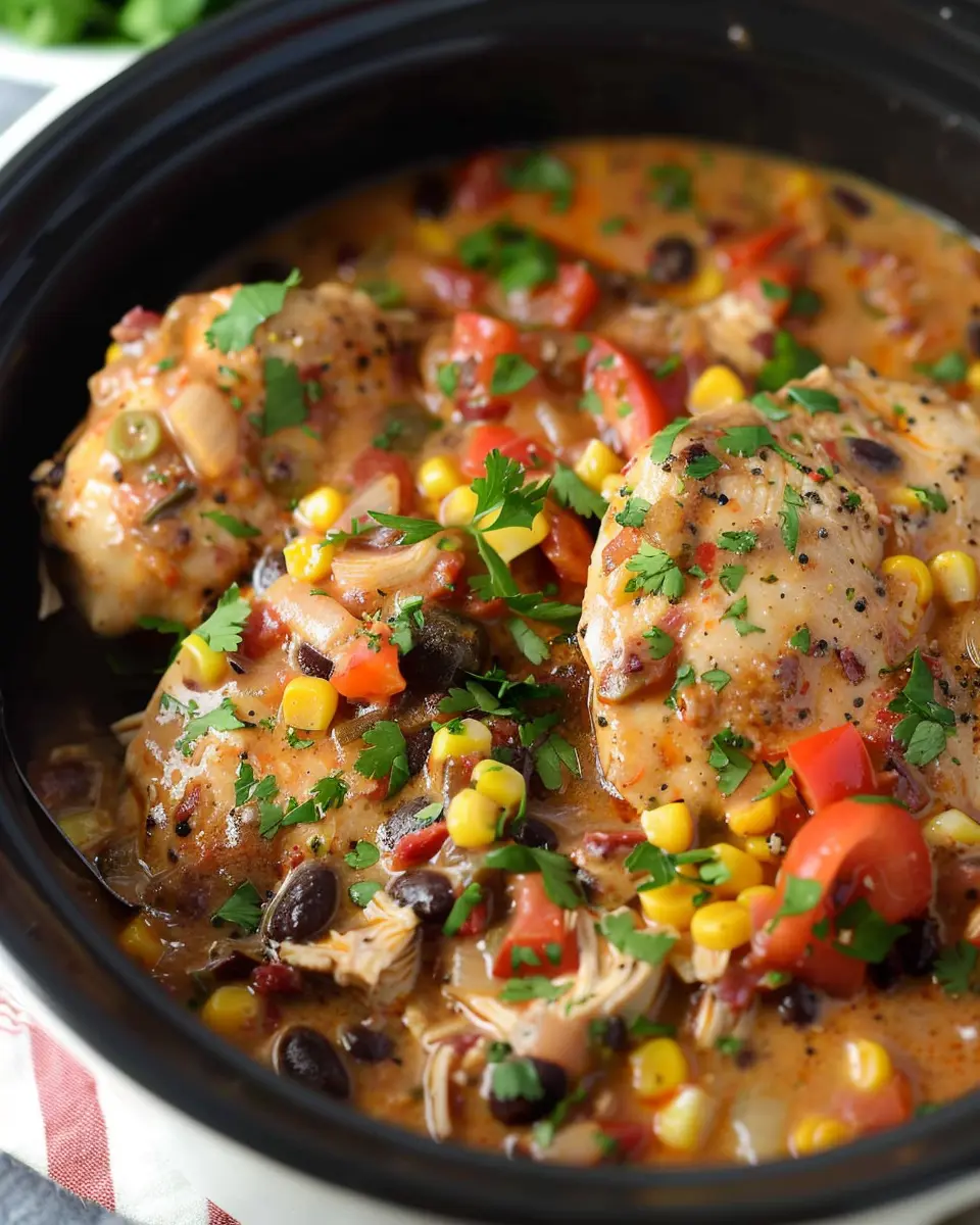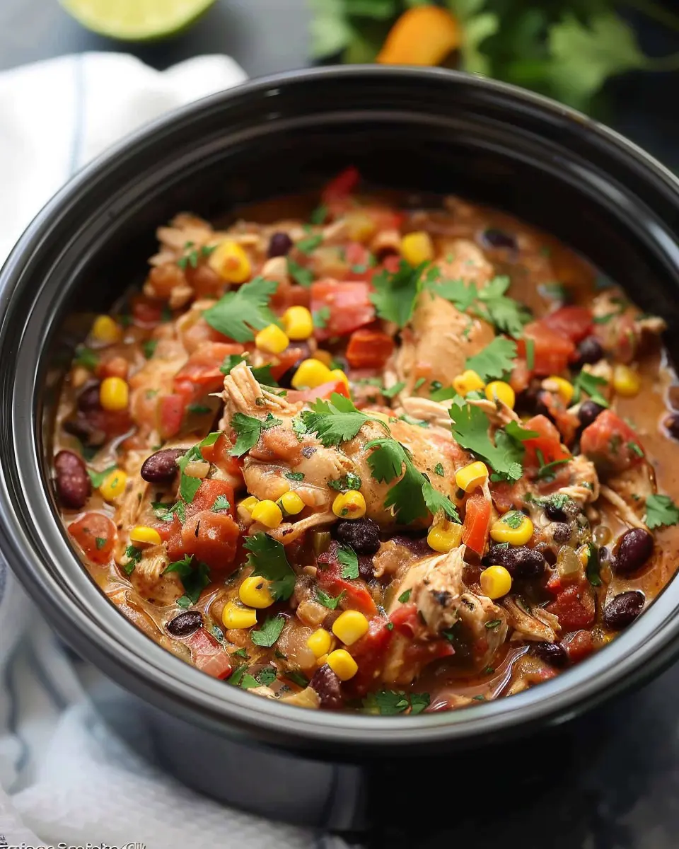 Your Fiesta Chicken Crock Pot Recipe is now ready to serve! Ladle the mixture into bowls and garnish with fresh cilantro for a pop of color and flavor.
