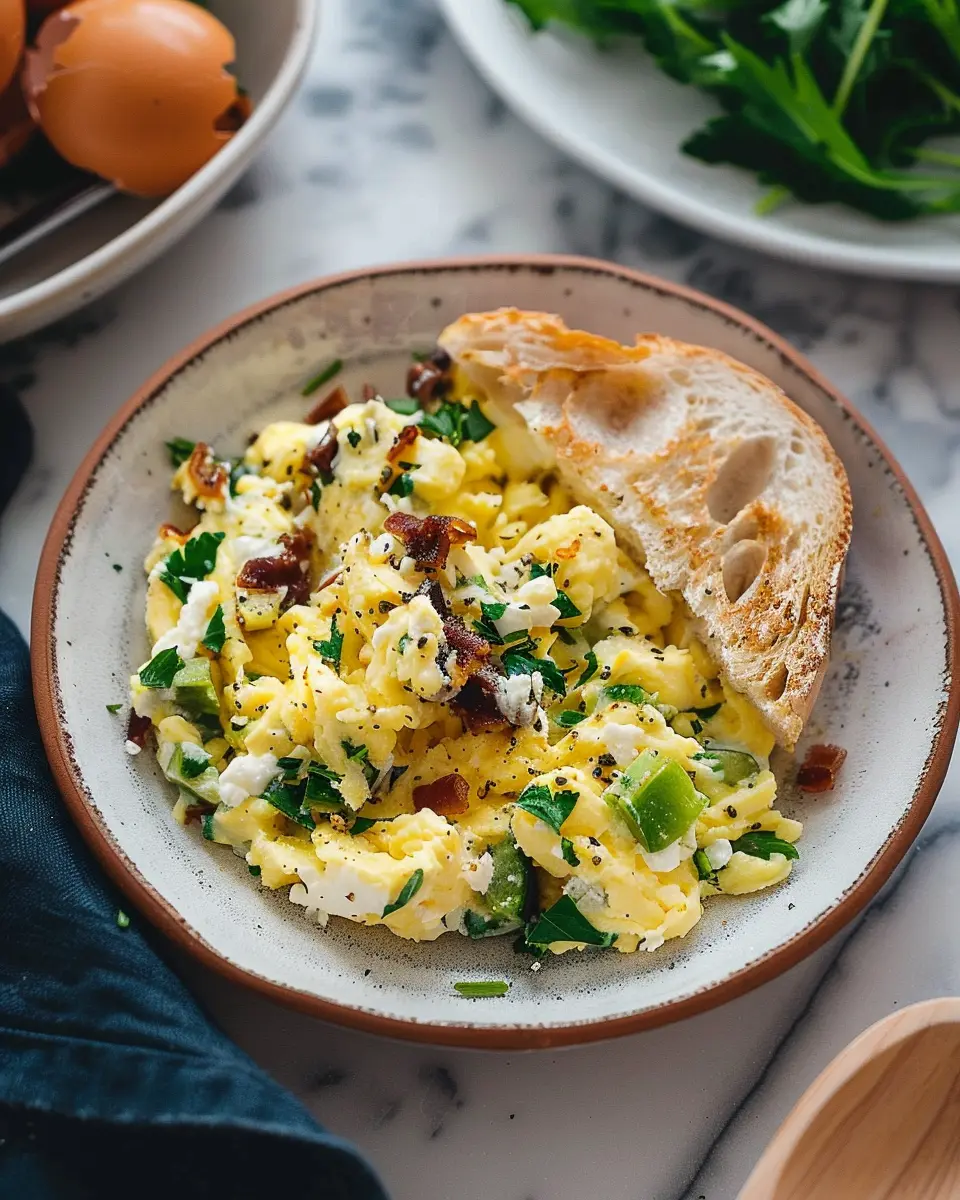 Once your eggs have reached the desired consistency, it’s crucial to serve them right away. The magic happens when they’re hot and fresh. Spoon the mixture onto a plate and garnish with more crumbled goat cheese, extra herbs, or a splash of hot sauce if you’re feeling adventurous. Serve alongside whole-grain toast or a light salad for a well-rounded meal.