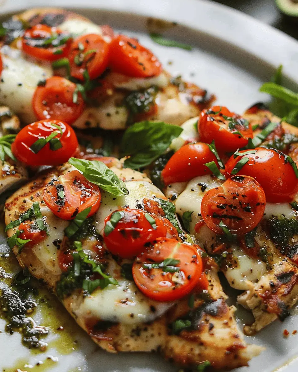Experience the delightful flavors of Grilled Chicken Margherita, combining juicy grilled chicken with fresh mozzarella and basil.