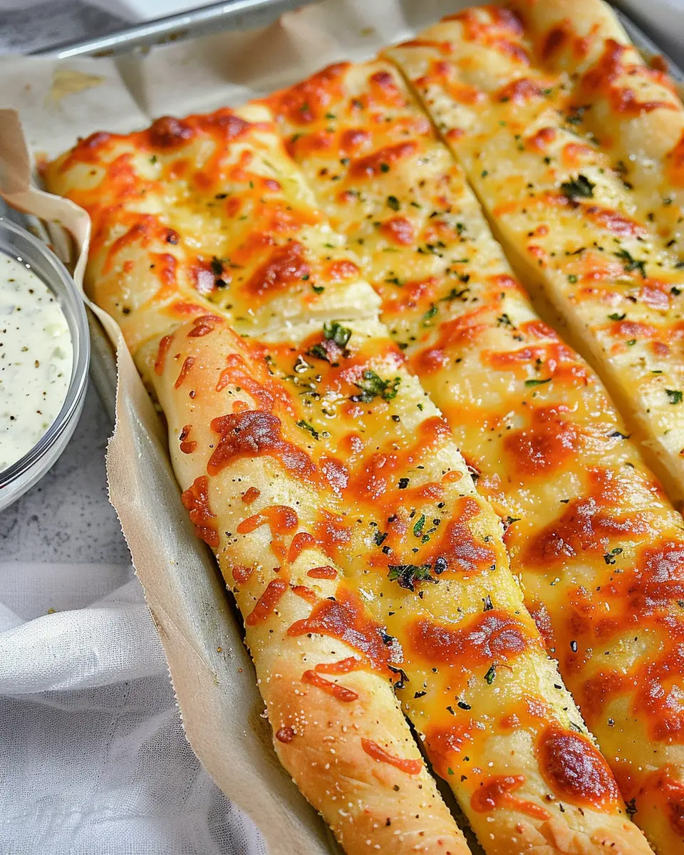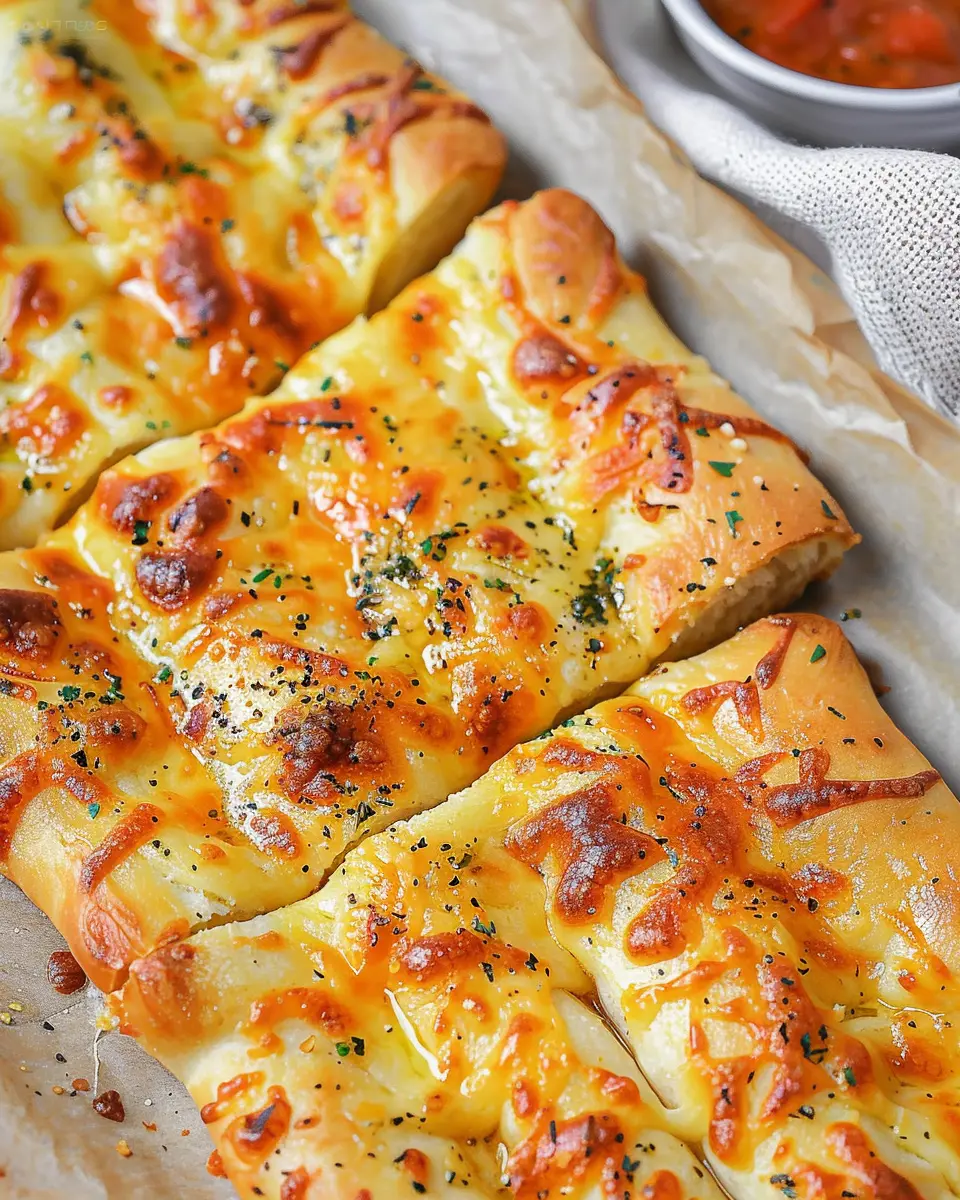 Delicious homemade cheesy garlic breadsticks that are perfect as a side or snack.