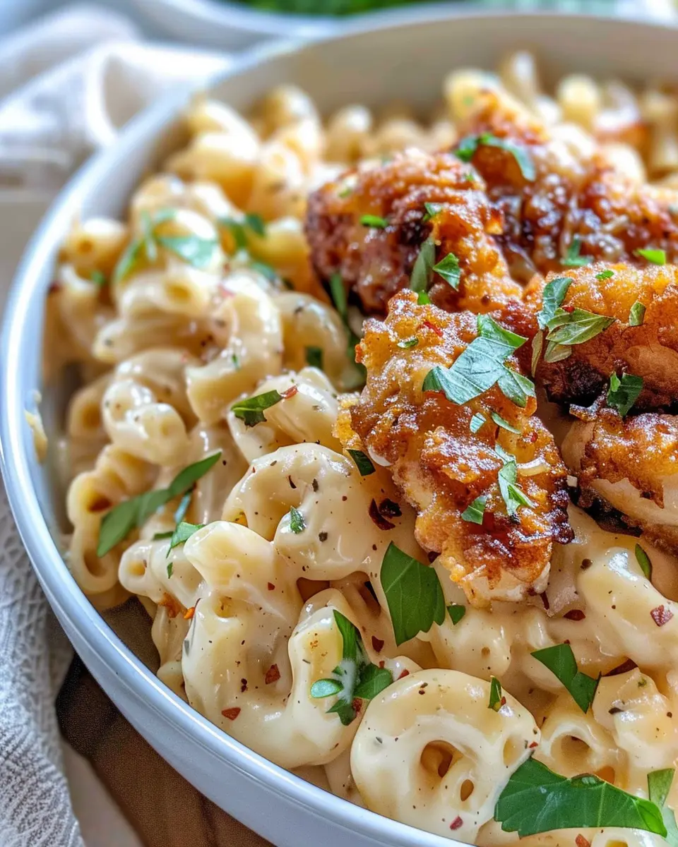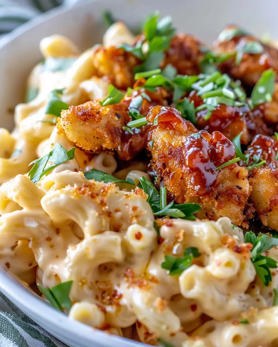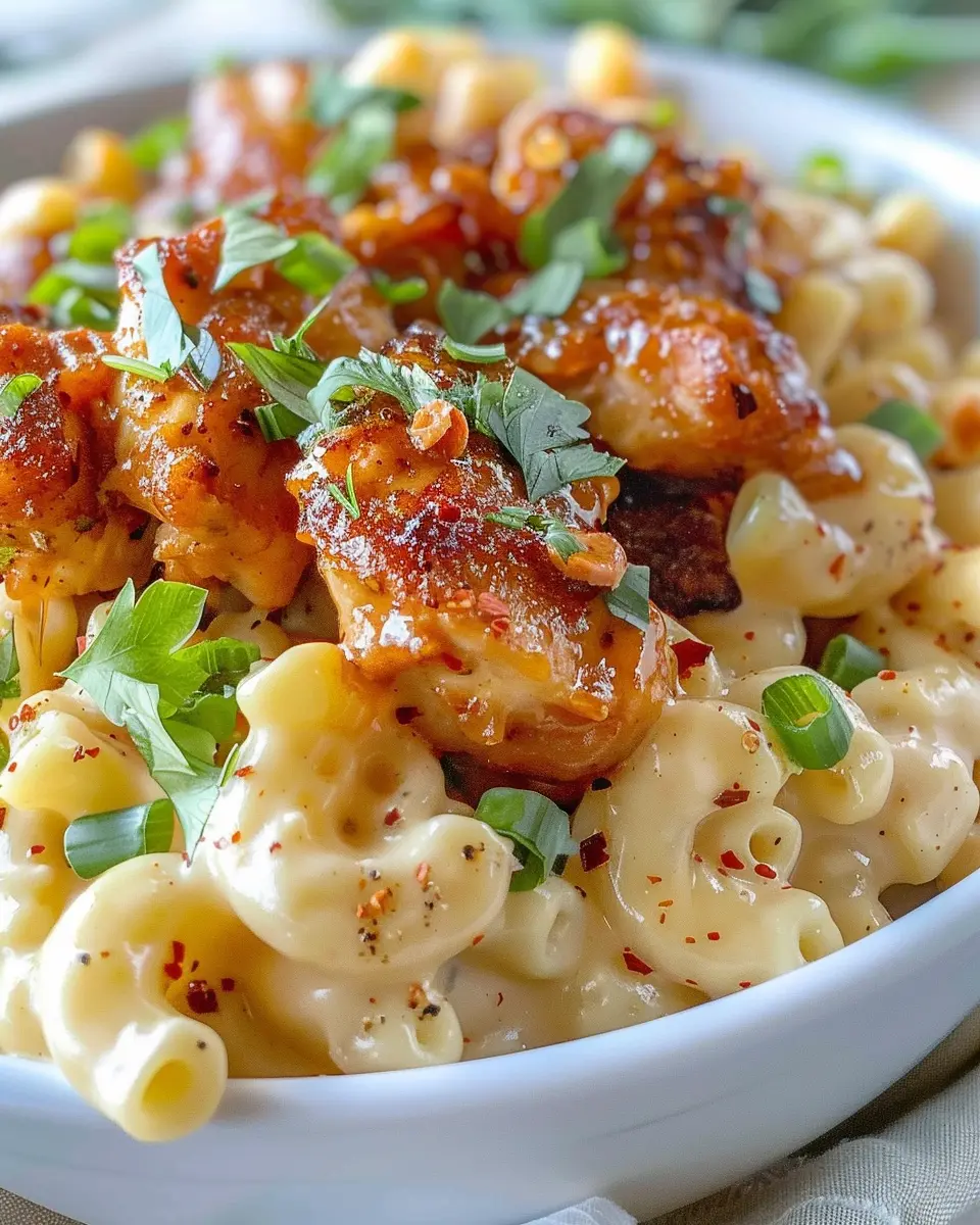 • Once baked, your Honey Pepper Chicken Mac and Cheese is ready to be devoured! You can garnish it with fresh herbs like parsley or chives for a pop of color and freshness.