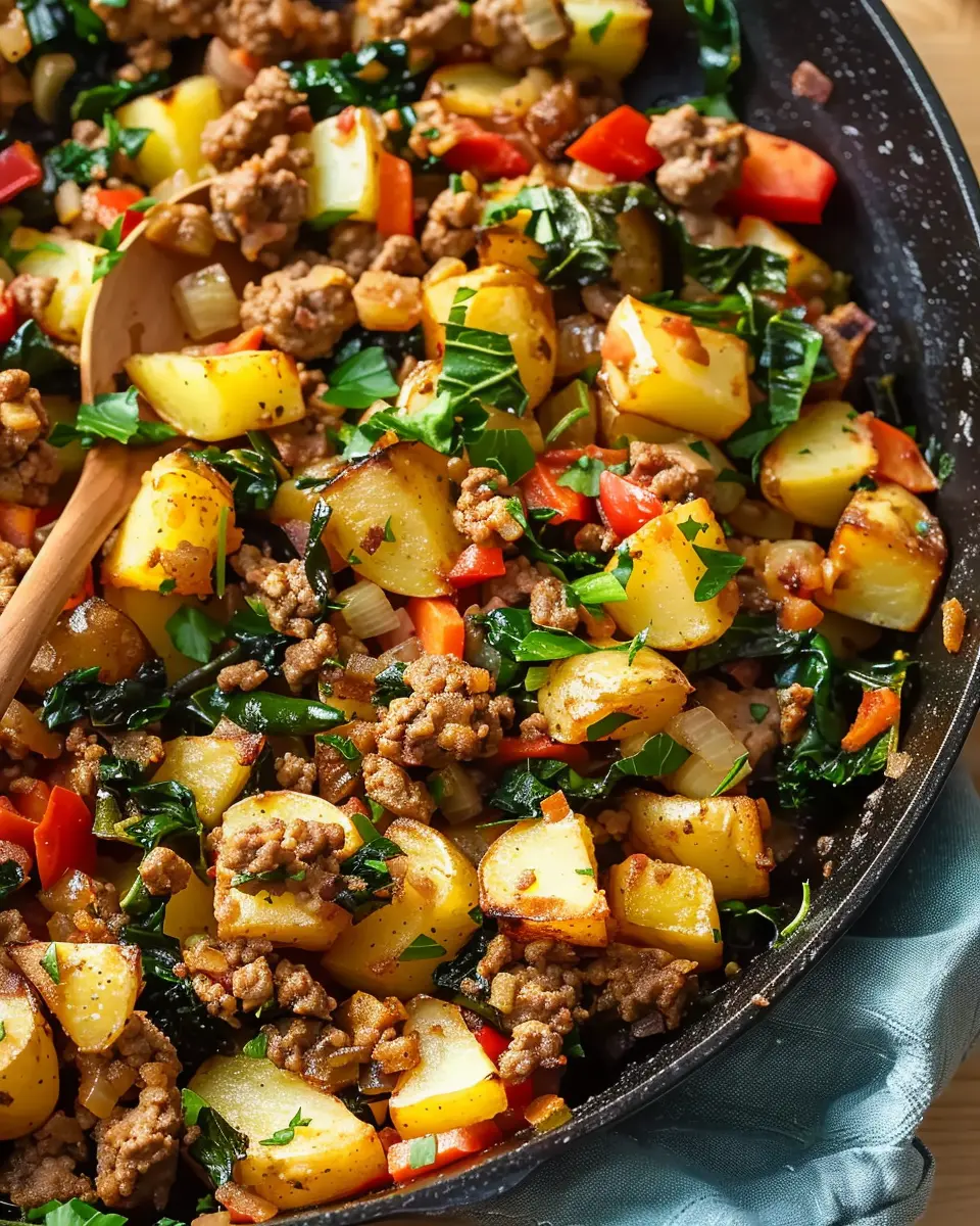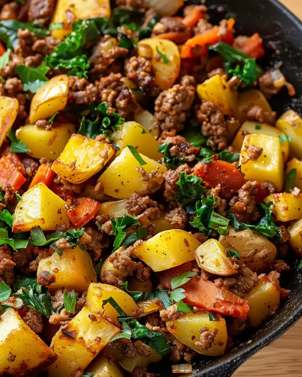 A quick and delicious skillet meal featuring seasoned ground beef and tender potatoes, perfect for busy weeknights.