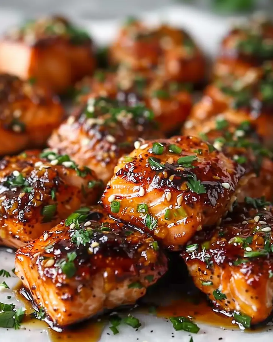 Delight in the rich flavors of these mouthwatering honey garlic salmon bites, a perfect quick and easy dish for any occasion.