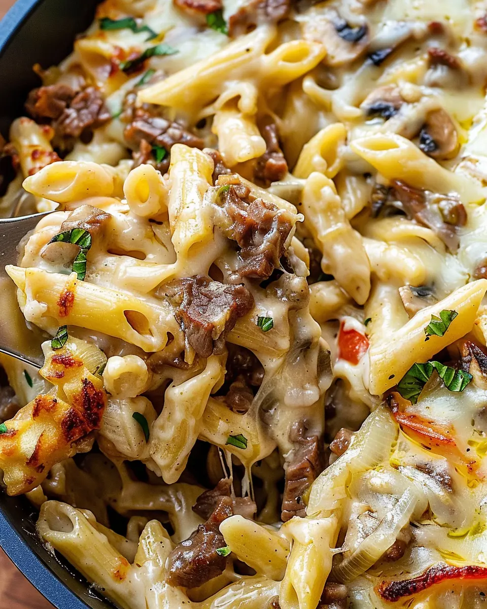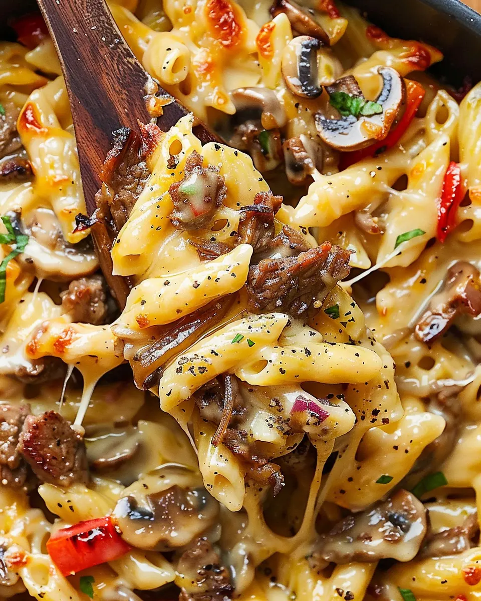 And voilà! You’ve transformed the classic Philly cheese steak into a comforting pasta dish that will wow your taste buds. This hearty meal is perfect for a weeknight dinner or a gathering with friends—everyone will be asking for the recipe.