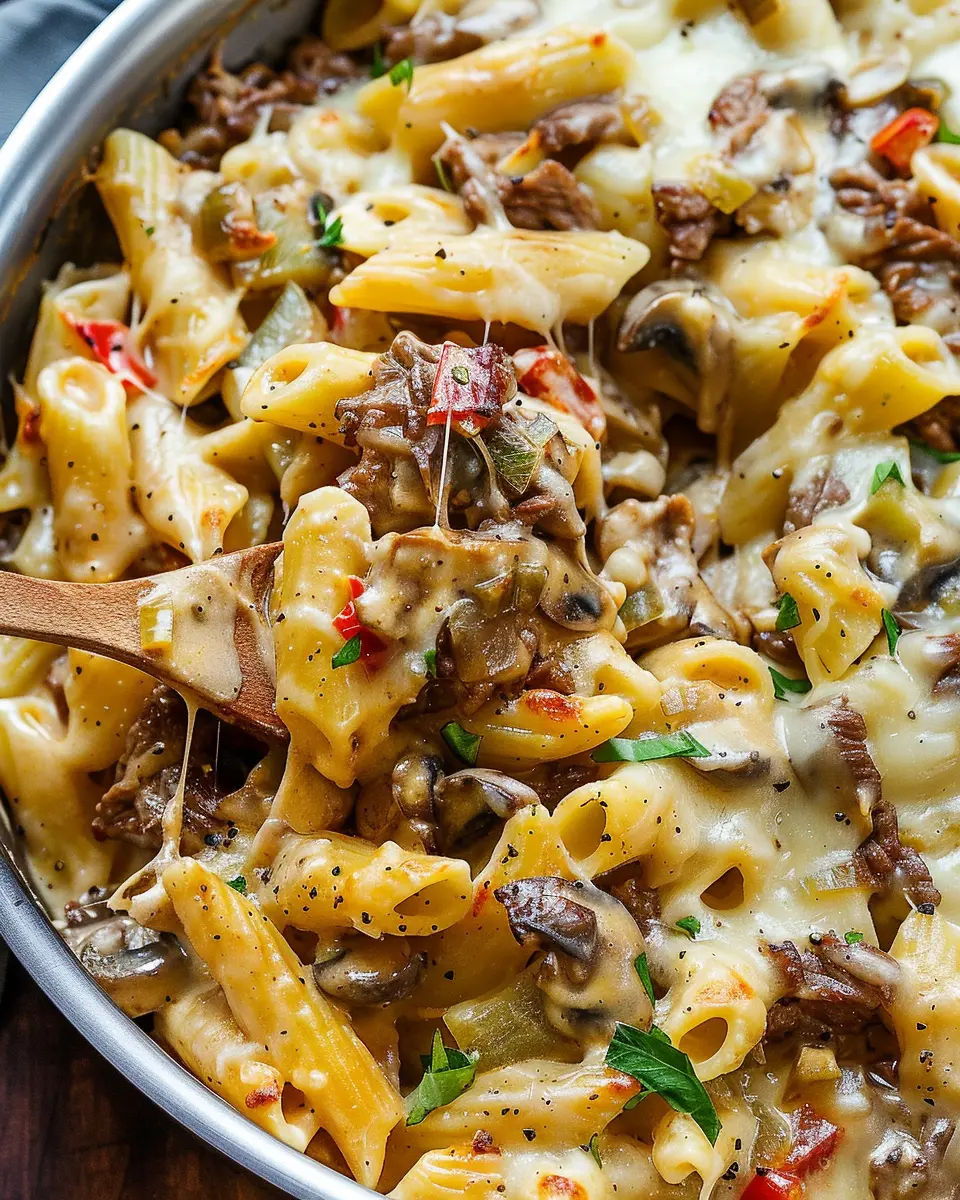 A delicious and hearty recipe that combines the classic flavors of a Philly cheese steak with pasta for a comfort food twist.