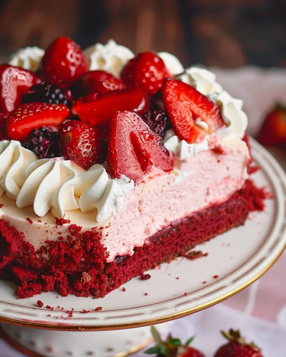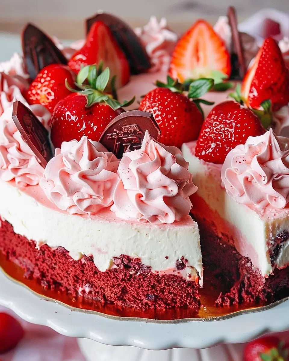 This Red Velvet Strawberry Cheesecake is the ultimate indulgent dessert, combining the rich flavors of red velvet cake with creamy cheesecake and fresh strawberries.