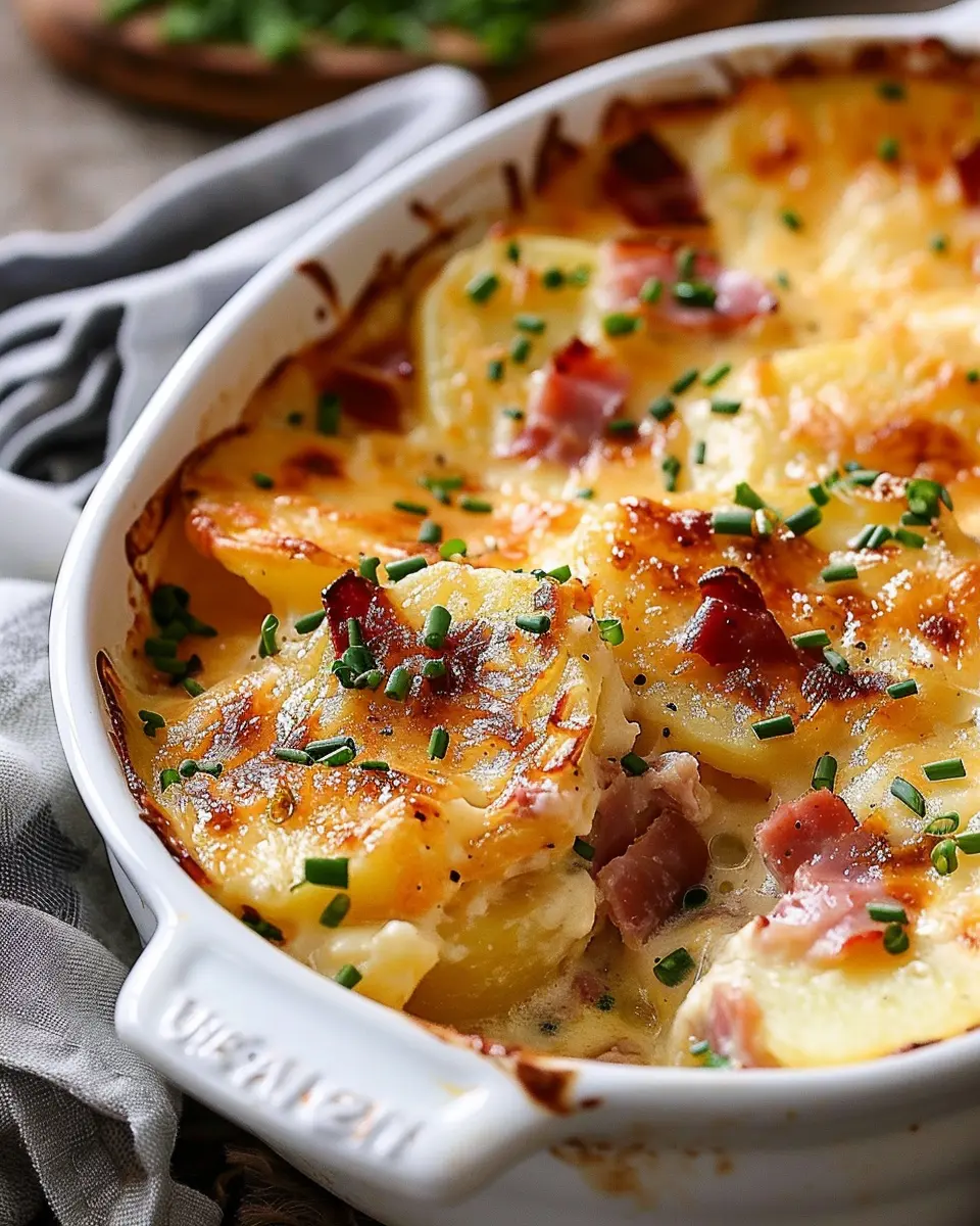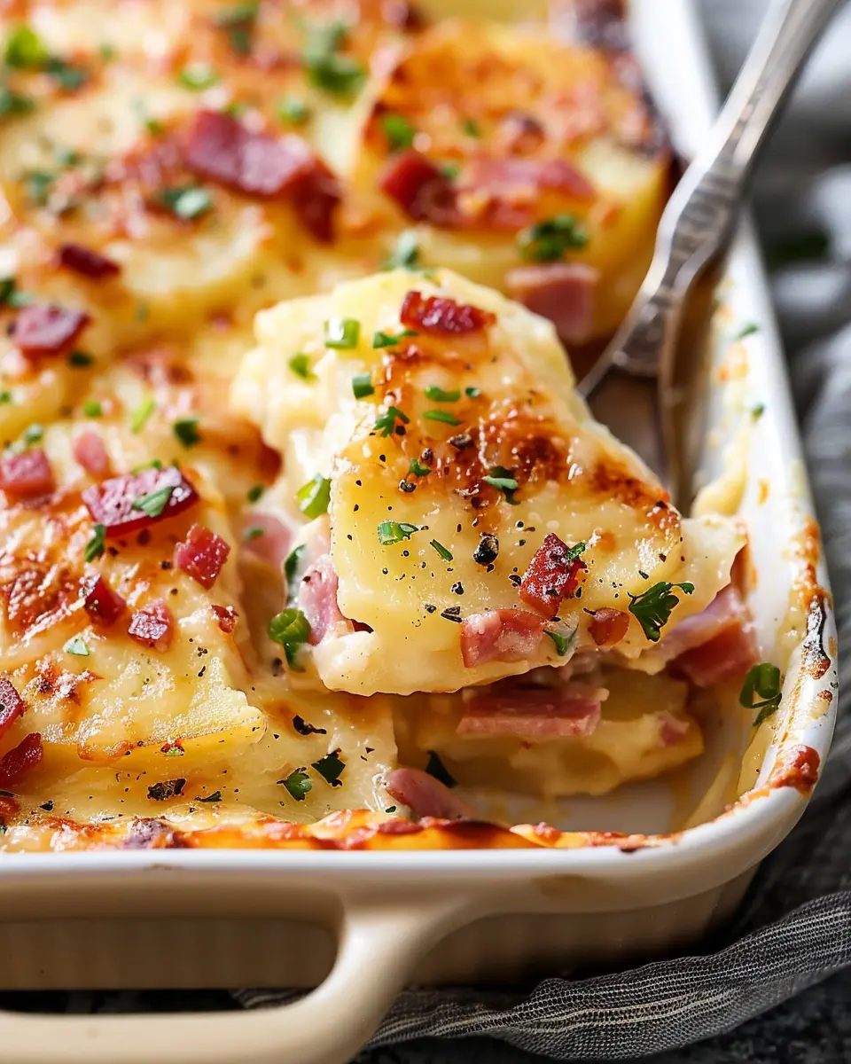 A delicious recipe for scalloped potatoes layered with chicken ham and turkey bacon, creating a comforting dish perfect for any occasion.