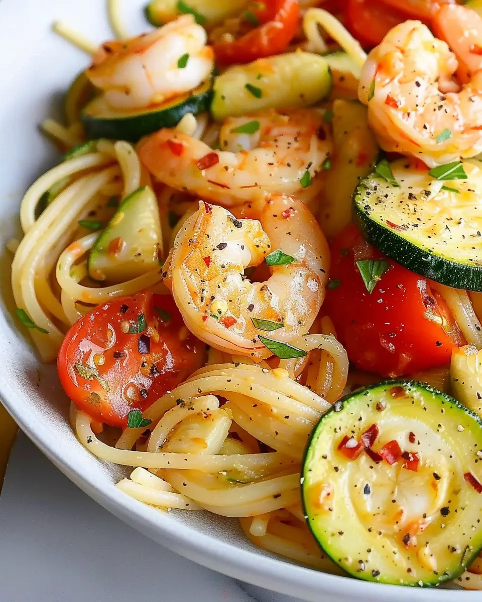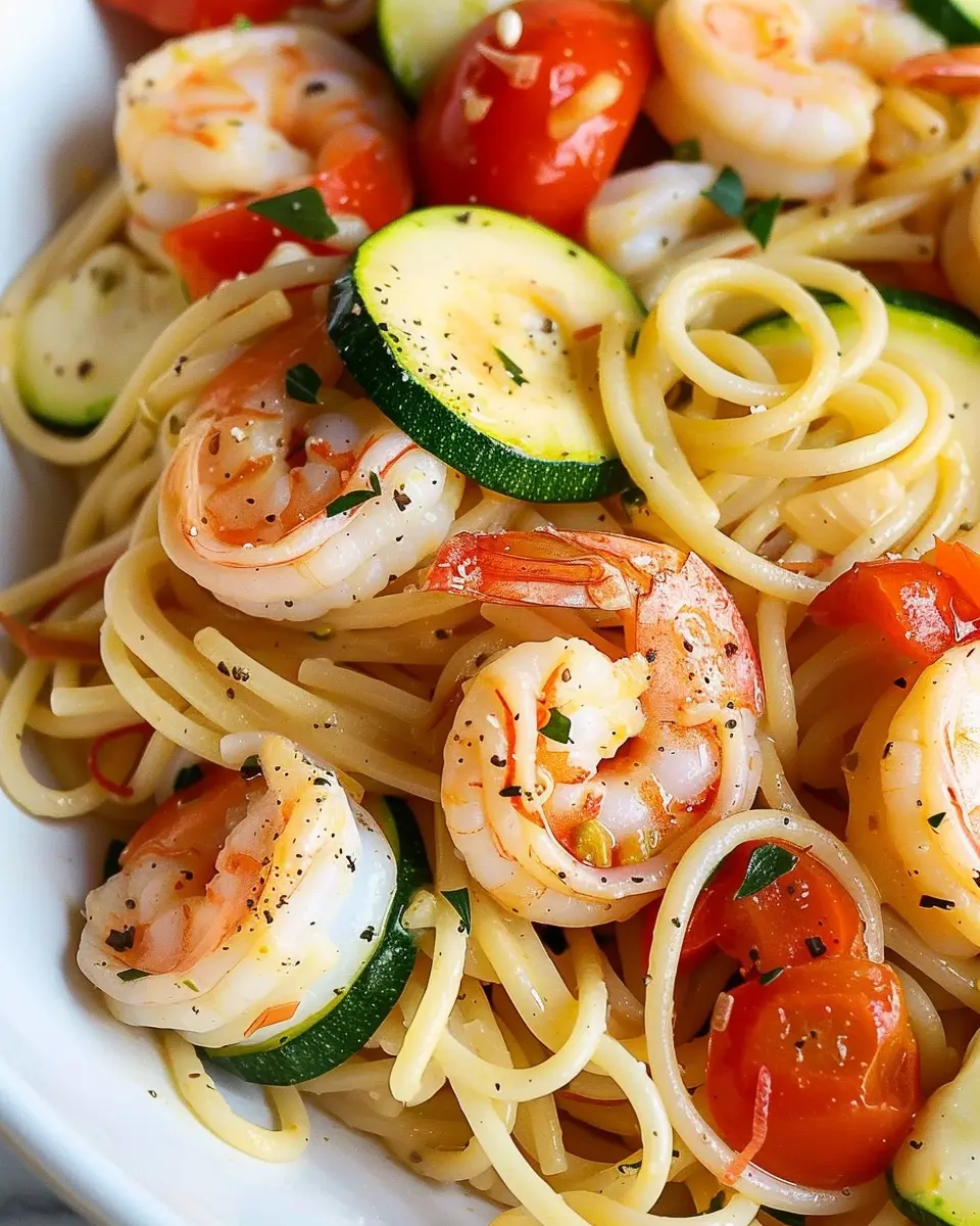 This shrimp pasta recipe is a delightful mix of fresh tomatoes and zucchini, making it a perfect meal for any day of the week.