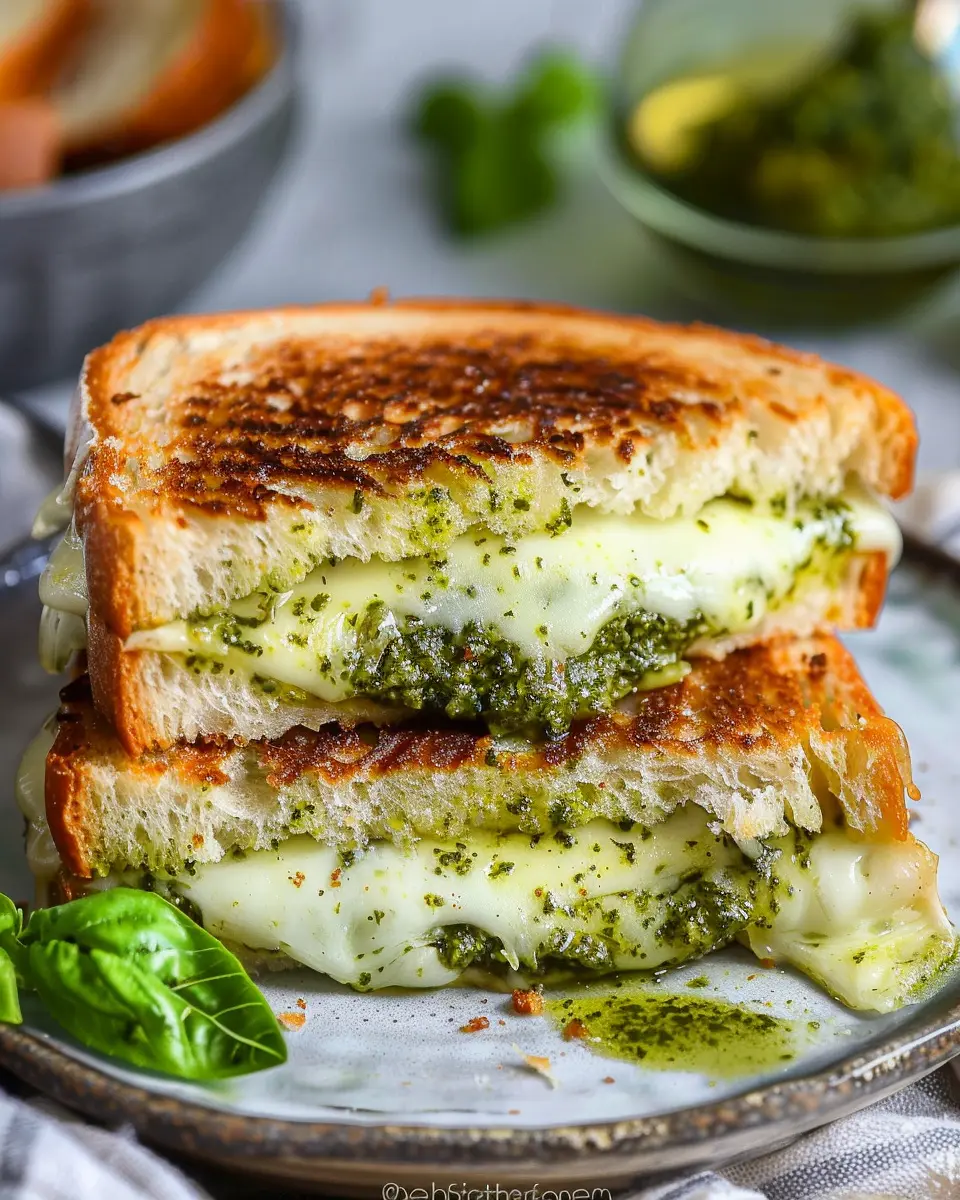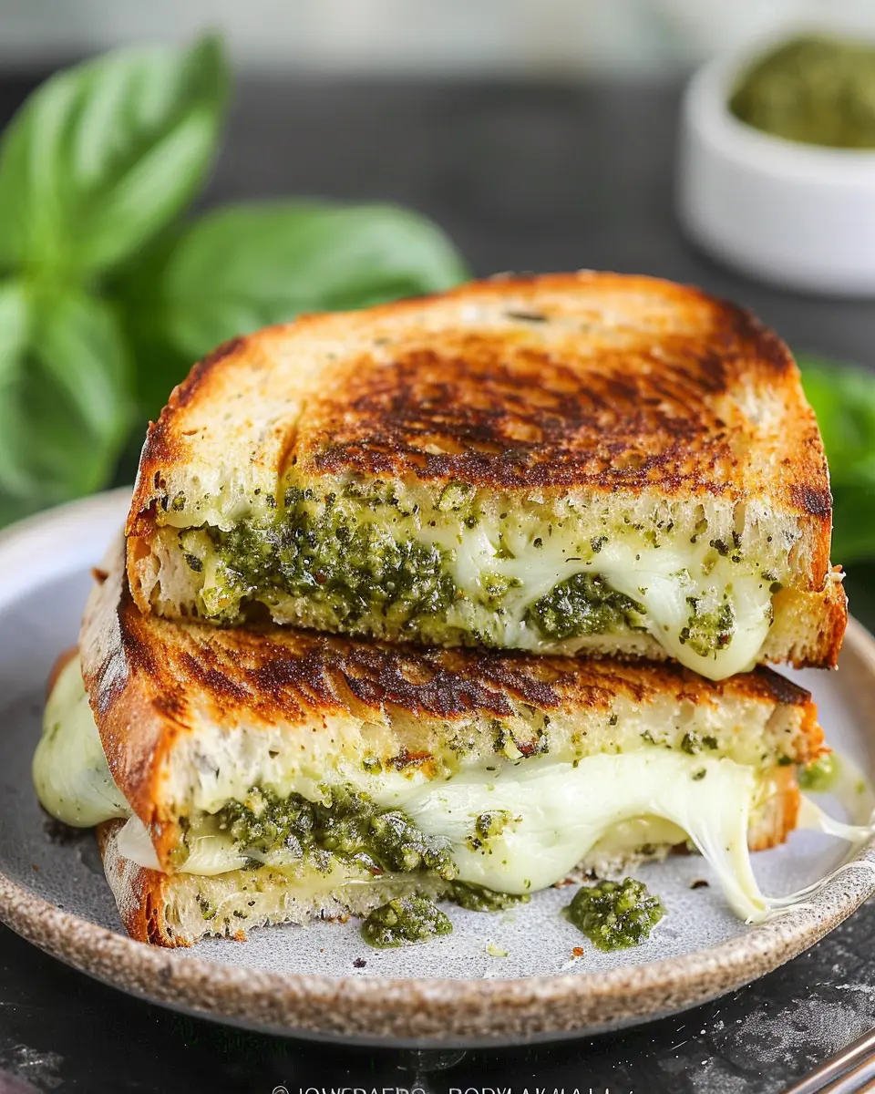 Indulge in the cheesy goodness of Sourdough Pesto Grilled Cheese, a delightful blend of crispy sourdough and rich pesto.